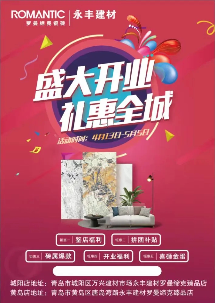 “盛大開業(yè),禮惠全城”羅曼締克瓷磚青島城陽、黃島雙店開業(yè)促銷活動不僅是為賦能經銷商搶占市場,同時也是為感恩一路相伴的新老客戶們。
