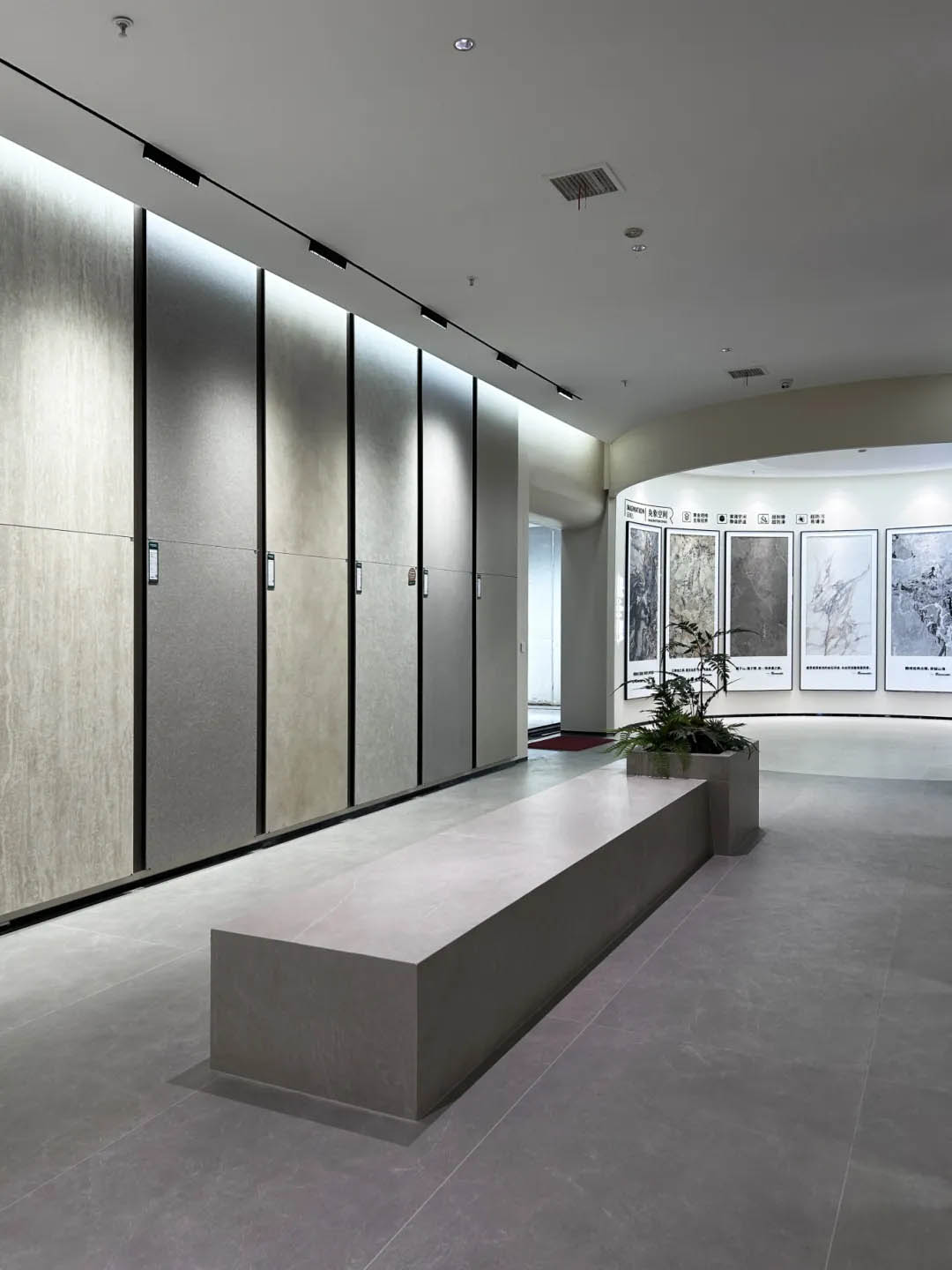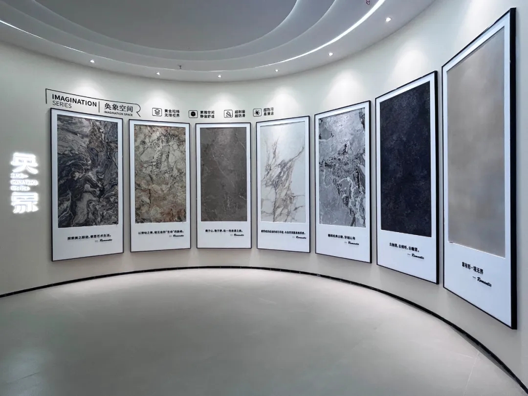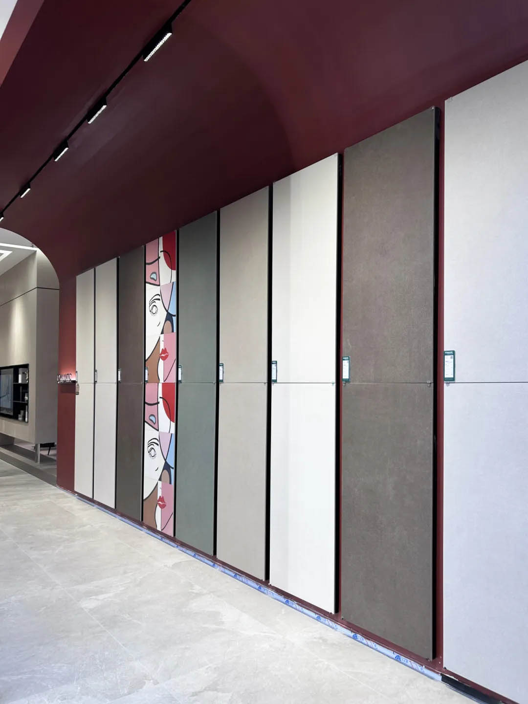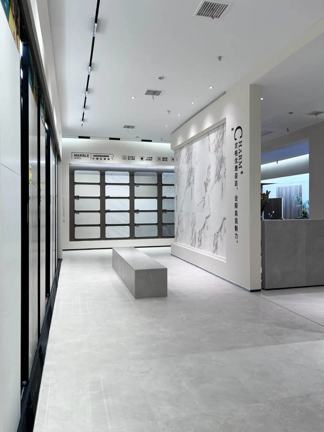 選材區(qū)排列整齊而豐富的產(chǎn)品,最大限度地體現(xiàn)產(chǎn)品真實細膩的質(zhì)感,堅實的品質(zhì)。從遠到近,更多的是帶著一種鑒賞的態(tài)度,把視覺集中在瓷磚產(chǎn)品自身的表現(xiàn)力上,以此更多關(guān)注產(chǎn)品本身的色彩、質(zhì)感、紋理等。