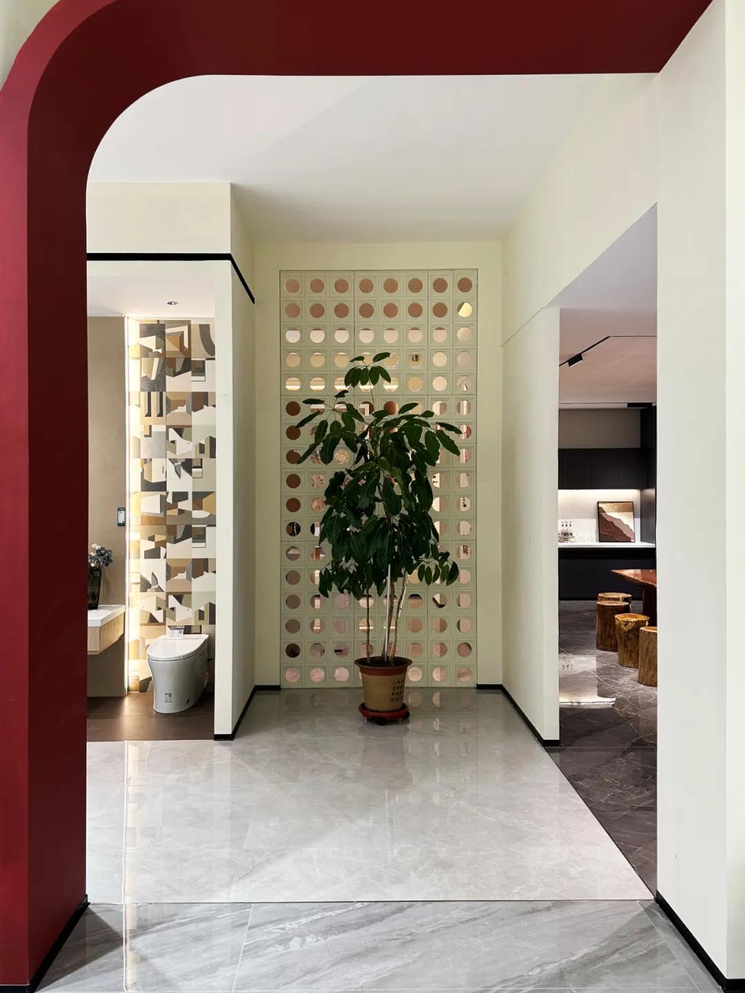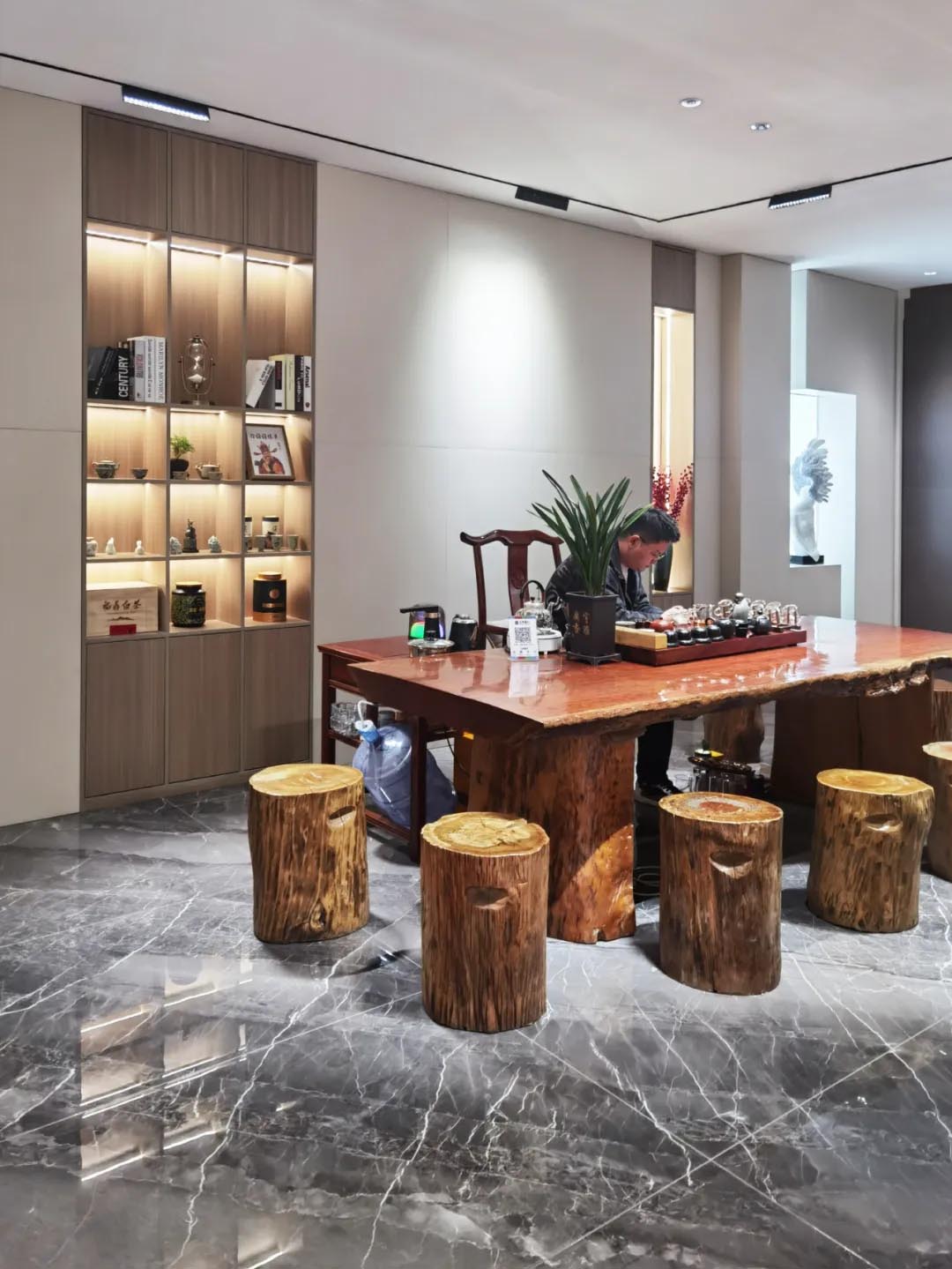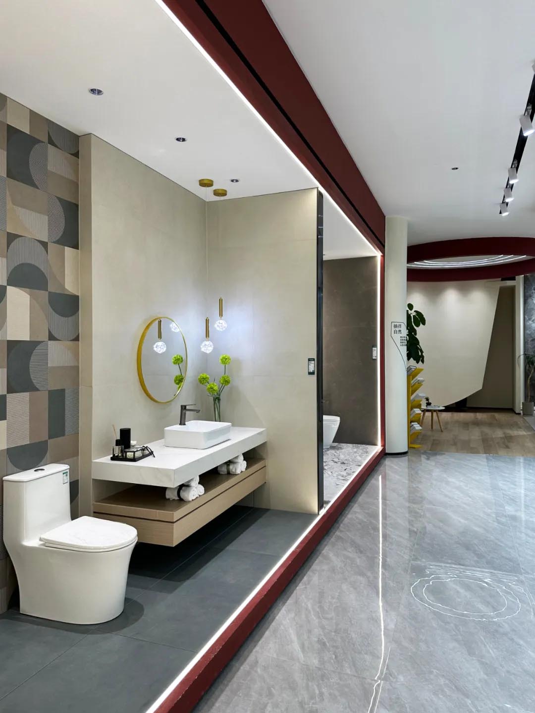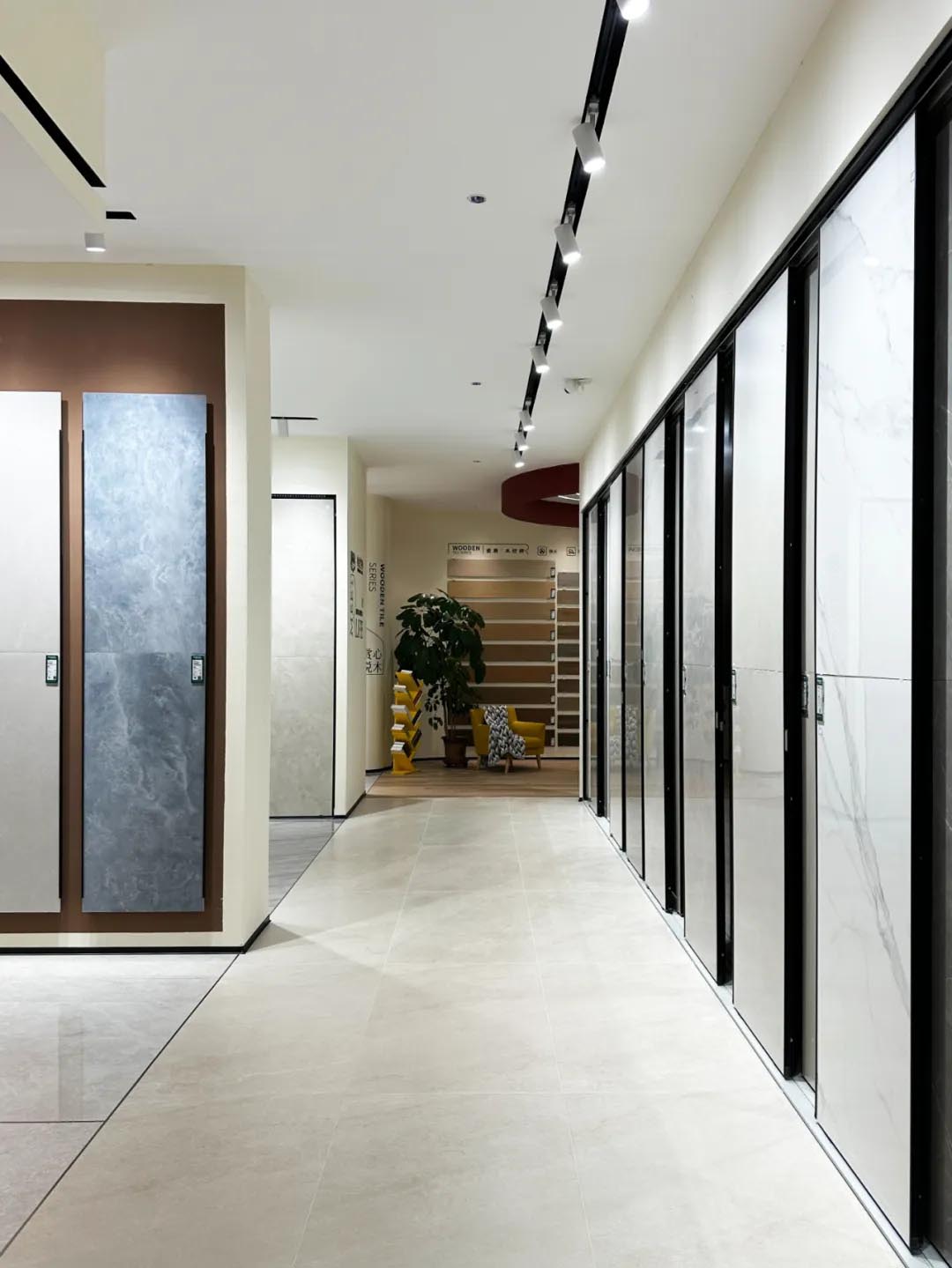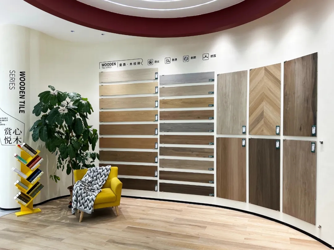不同規(guī)格產(chǎn)品選材區(qū)穿插在各空間展示區(qū)中,產(chǎn)品按品類集中分區(qū)的布局增加產(chǎn)品系列化與產(chǎn)品整體飽滿感,所展示的產(chǎn)品皆為時(shí)下流行的大規(guī)格產(chǎn)品,讓空間與產(chǎn)品的層次性得到充分展現(xiàn)。