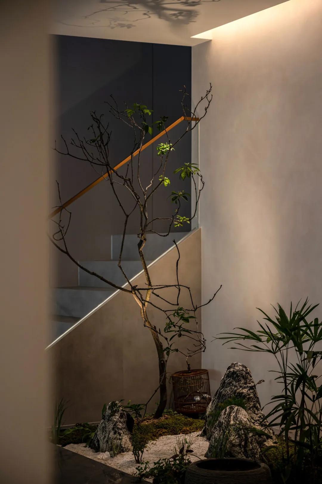 樓梯一隅由光、影、景、物等自然手法,來(lái)營(yíng)造空間的豐富層次,構(gòu)建出一處悠然天地。