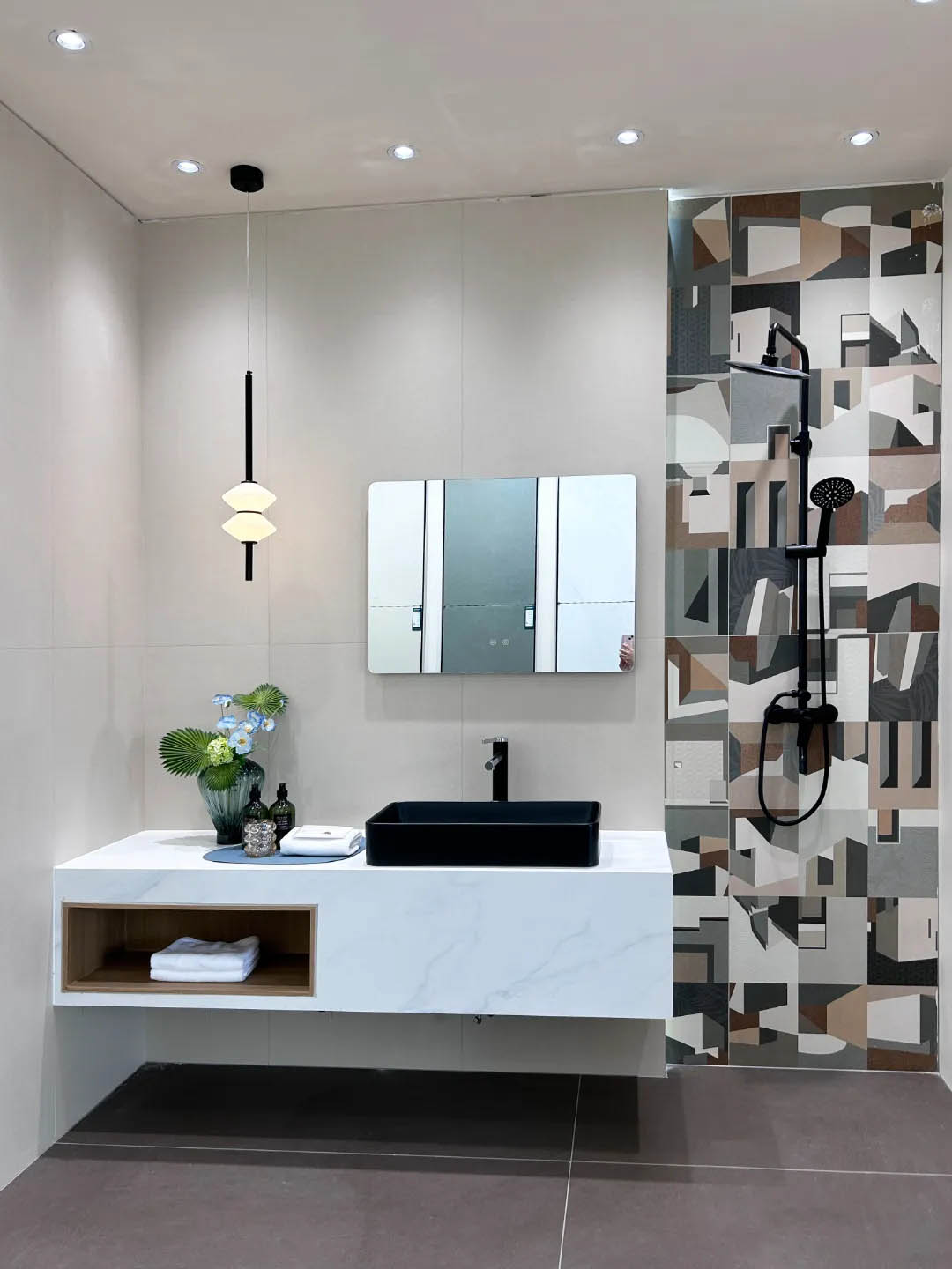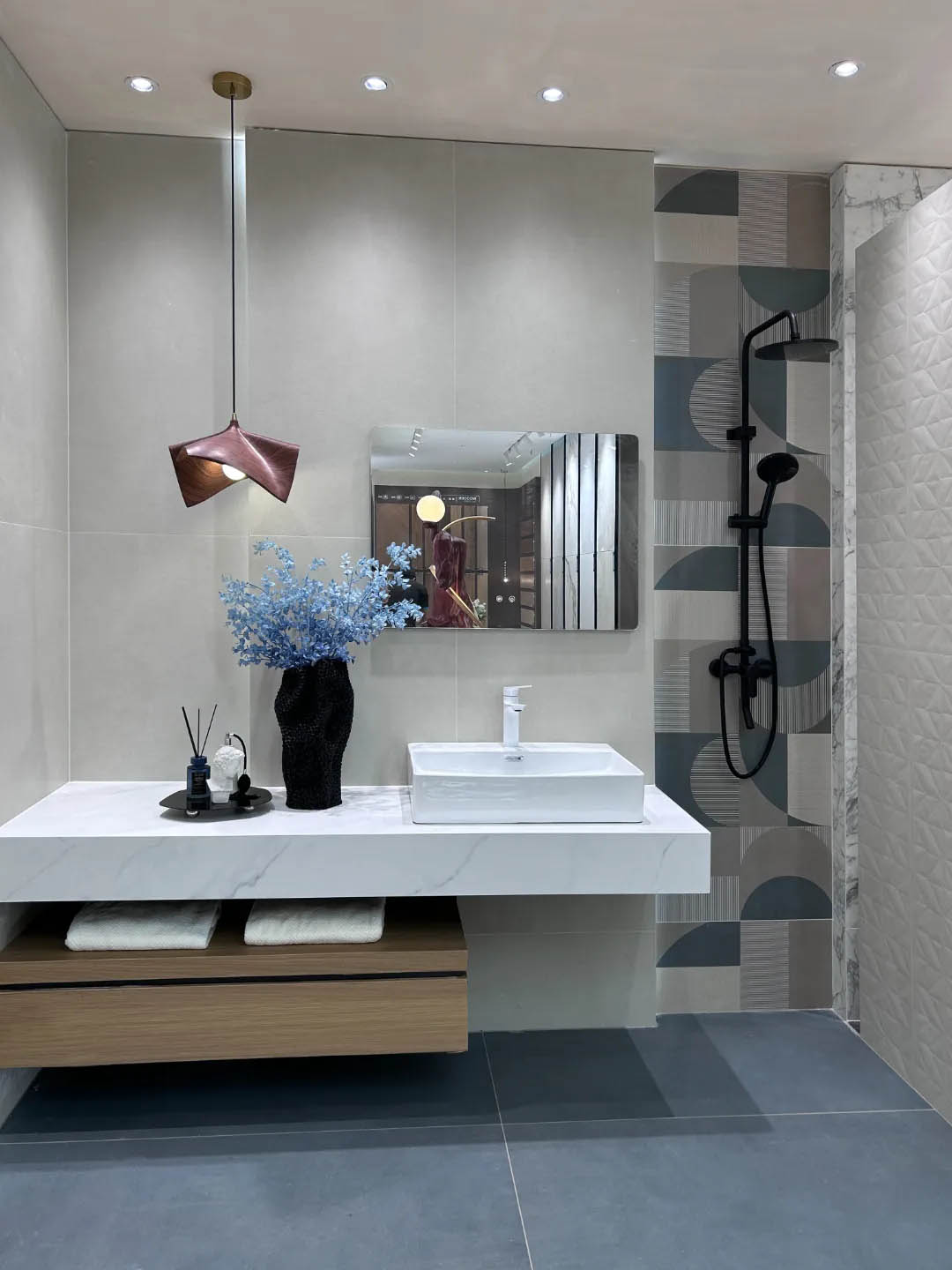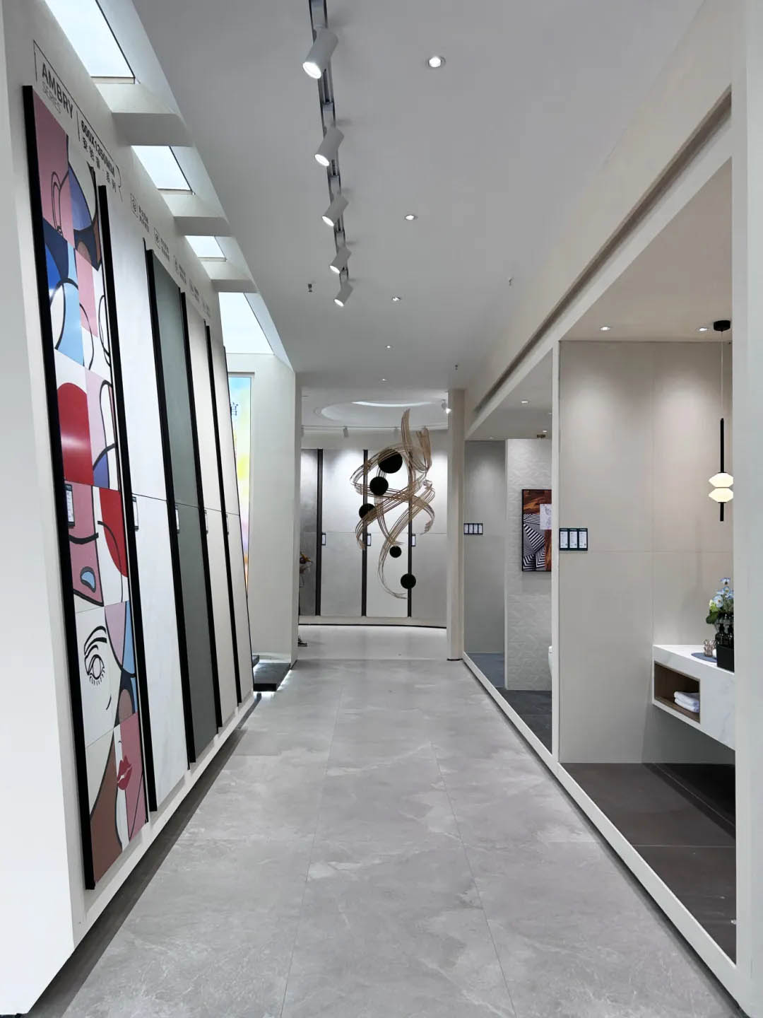 視覺(jué)墻采用900x1800mm翡冷翠彩石,粗曠豪邁的紋理,述說(shuō)著大自然的磅礴之美,與之形成鮮明對(duì)比的是從切面空間到直線的選材區(qū)轉(zhuǎn)變,讓瀏覽動(dòng)線更加豐富。