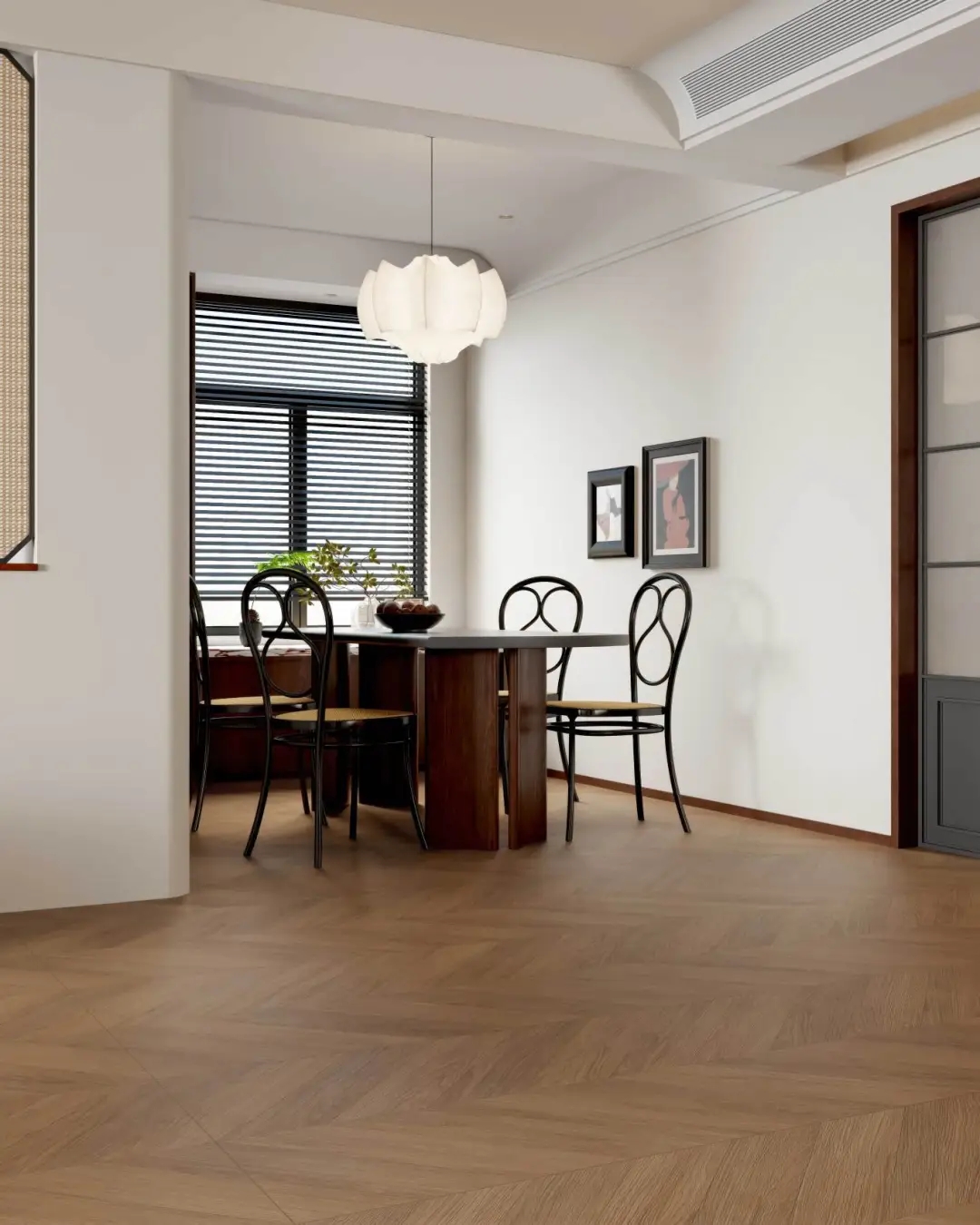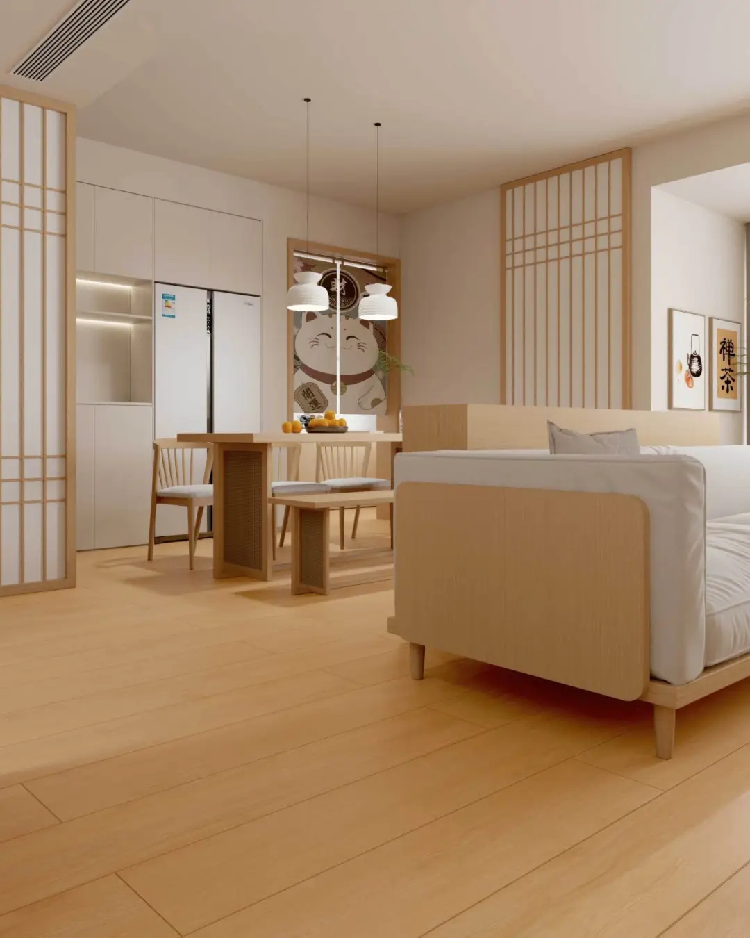 整體空間以原木為筆觸,梧桐黃調(diào)木紋磚沉穩(wěn)肌理,結(jié)合三七錯(cuò)縫鋪法,在日式原木家具的溫潤觸感下,織就一幅克制而豐盈的畫卷。