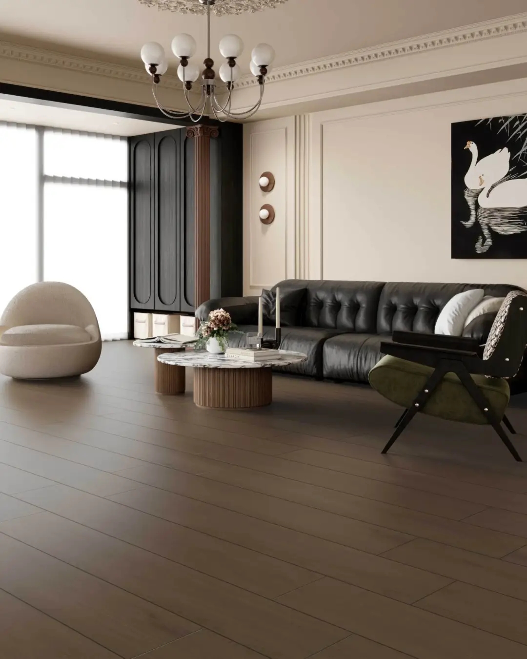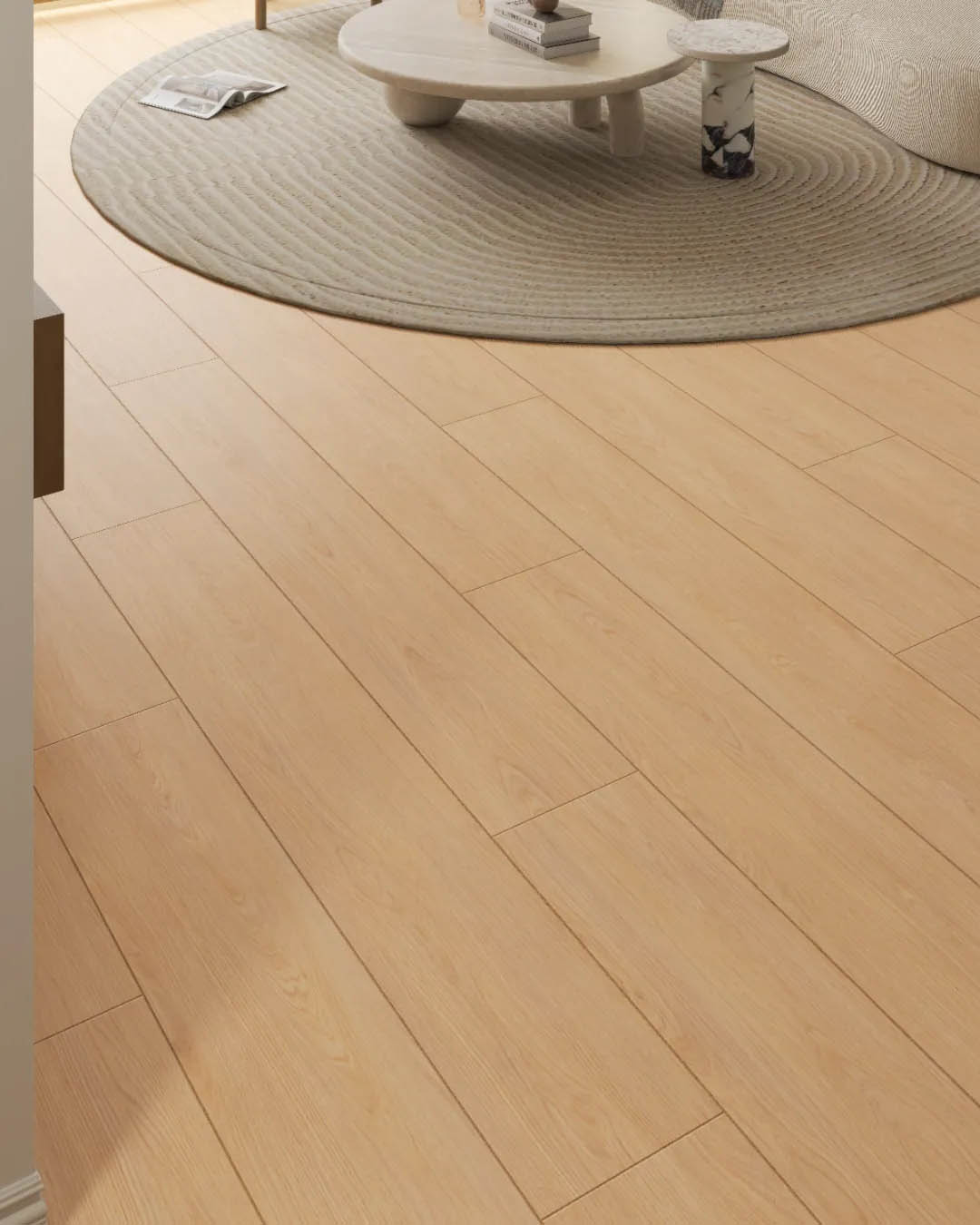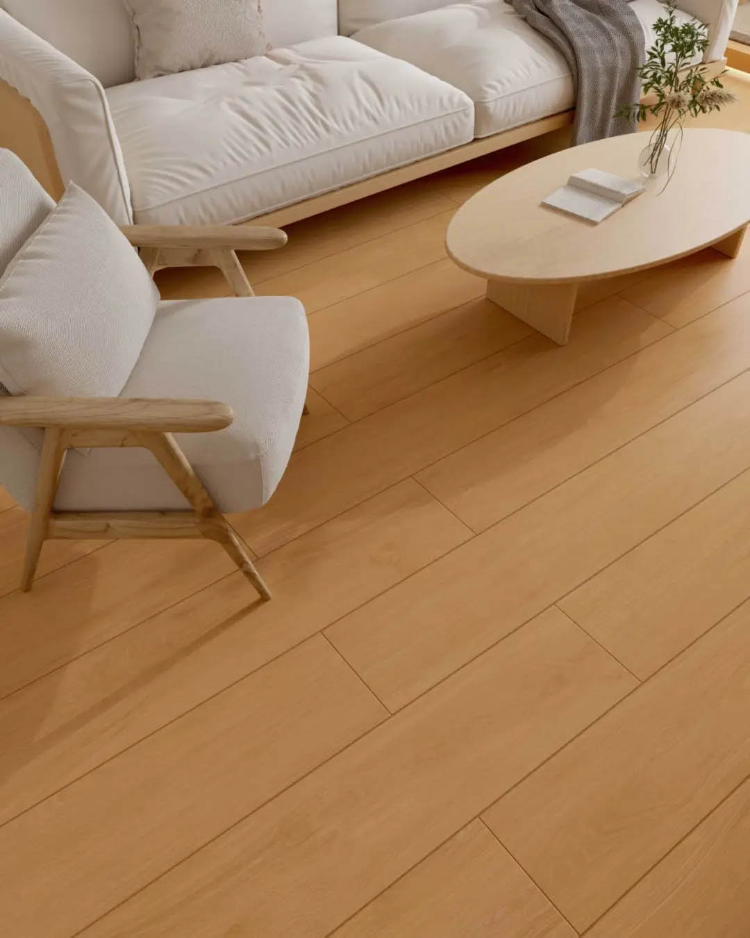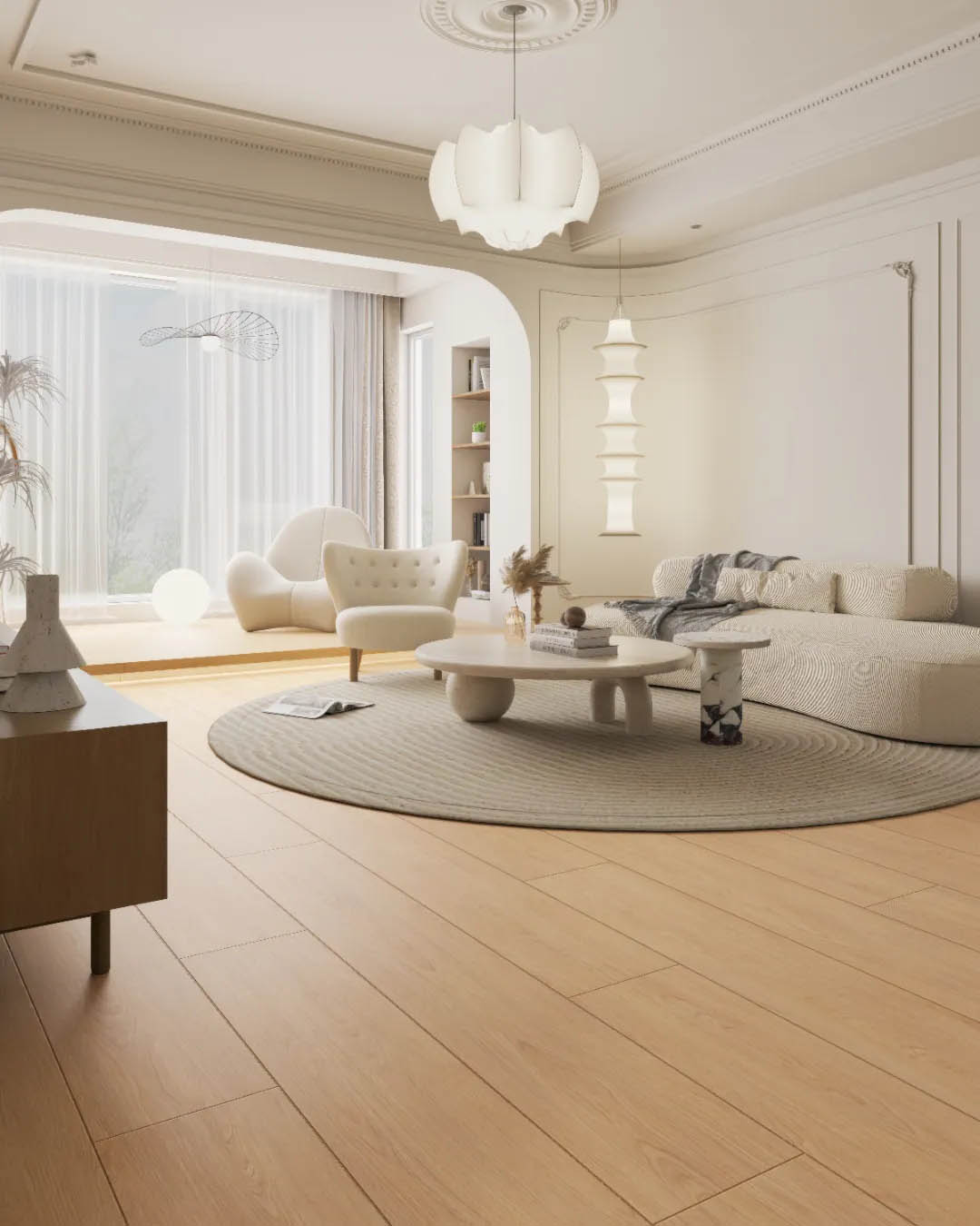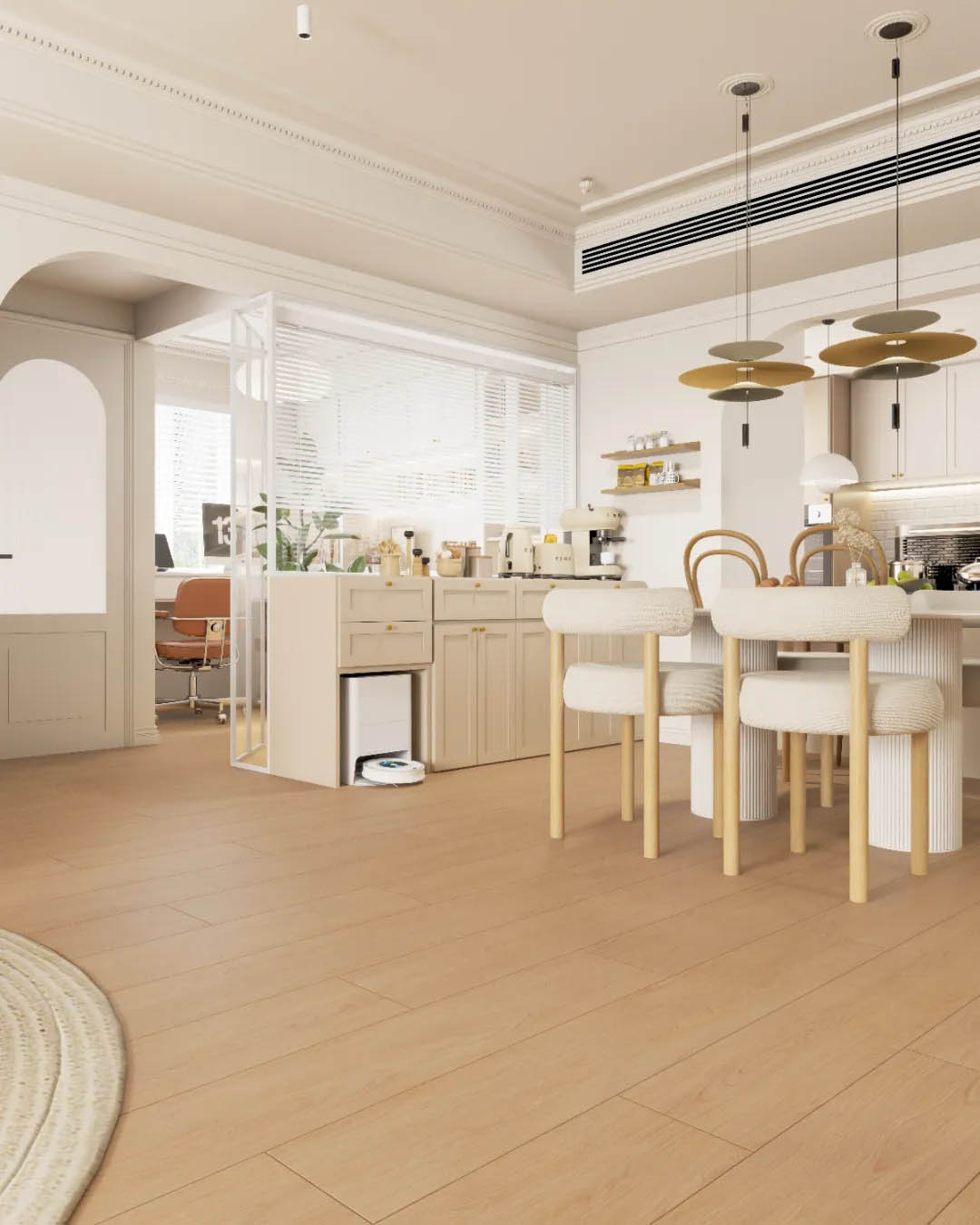 整屋采用奶油色為基調(diào),搭配上250x1500mm原木色木紋磚通鋪,采用數(shù)碼模具工藝,還原木材紋理和純正色彩,盡顯自然溫潤與原始美感。