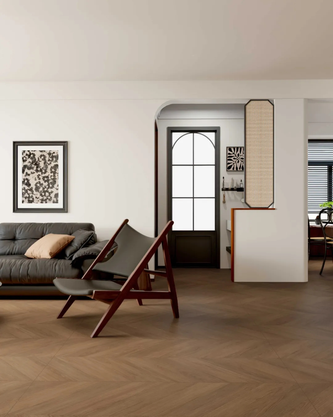 動(dòng)靜分隔,動(dòng)線流暢,通過軟裝和胡桃木色的木紋磚增添復(fù)古韻味,魚骨紋鋪法,沉穩(wěn)內(nèi)斂,讓空間如一部1960年代黑膠唱片機(jī),在婆娑中低吟復(fù)古爵士旋律。